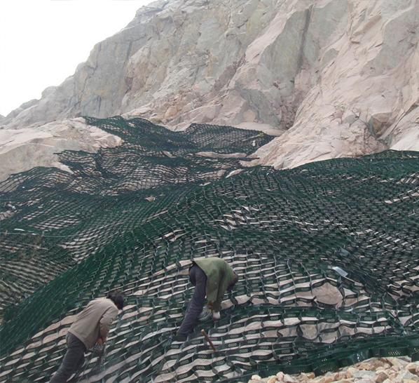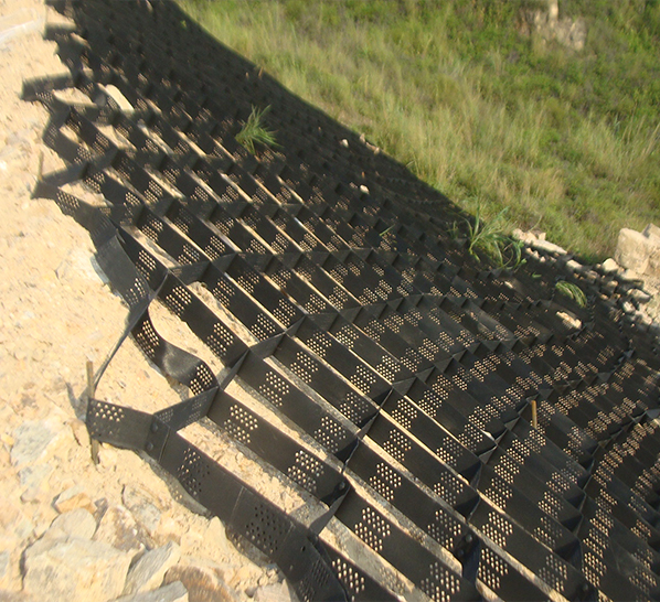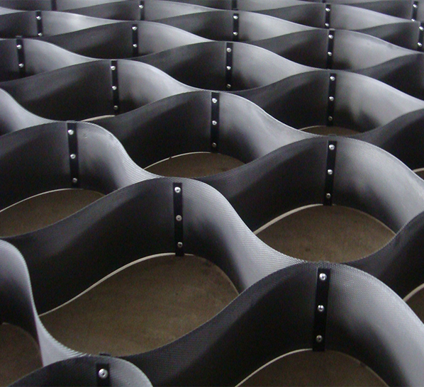 土工格室是由高強度的HDPE或PP共聚料寬帶,經(jīng)過強力焊接或鉚接而形成的一片網(wǎng)狀格室結(jié)構(gòu)。它伸縮自如,運輸時可縮疊起來,使用時張開并又充填土石或混凝土料,構(gòu)成具有強大側(cè)向限制和大剛度的結(jié)構(gòu)體。它可用來做為墊層,處理軟弱地基增大地基的承載能力,也可鋪設(shè)在坡面上構(gòu)成坡面防護結(jié)構(gòu),還可以用來建造支擋結(jié)構(gòu)等。