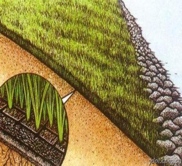 三維植被網(wǎng)是以熱塑性樹脂為原料,采用科學(xué)配方,經(jīng)擠出、拉伸等工序精制而成。它無腐蝕性,化學(xué)性穩(wěn)定,對大氣、土壤、微生物呈惰性。該產(chǎn)品底層為一個高模量基礎(chǔ)層,采用雙向拉伸技術(shù),其強度高,足以防止植被網(wǎng)變形,并能有效防止水土流失。表層為一個起泡層,膨松的網(wǎng)包以便填入土壤、種上草籽幫助固土,這種三維結(jié)構(gòu)能更好地與土壤相結(jié)合。在邊坡防護(hù)中使用三維植被能有效地保護(hù)坡面不受風(fēng)、雨、洪水的侵蝕。該產(chǎn)品功能是有利于植被生長。隨著植被的形成,它的主要功能是幫助草根系統(tǒng)增強其抵抗自然水土流失能力。