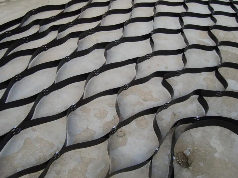 土工格室是由高強(qiáng)度的HDPE或PP共聚料寬帶,經(jīng)過強(qiáng)力焊接或鉚接而形成的一片網(wǎng)狀格室結(jié)構(gòu)。它伸縮自如,運(yùn)輸時(shí)可縮疊起來,使用時(shí)張開并又充填土石或混凝土料,構(gòu)成具有強(qiáng)大側(cè)向限制和大剛度的結(jié)構(gòu)體。它可用來做為墊層,處理軟弱地基增大地基的承載能力,也可鋪設(shè)在坡面上構(gòu)成坡面防護(hù)結(jié)構(gòu),還可以用來建造支擋結(jié)構(gòu)等。