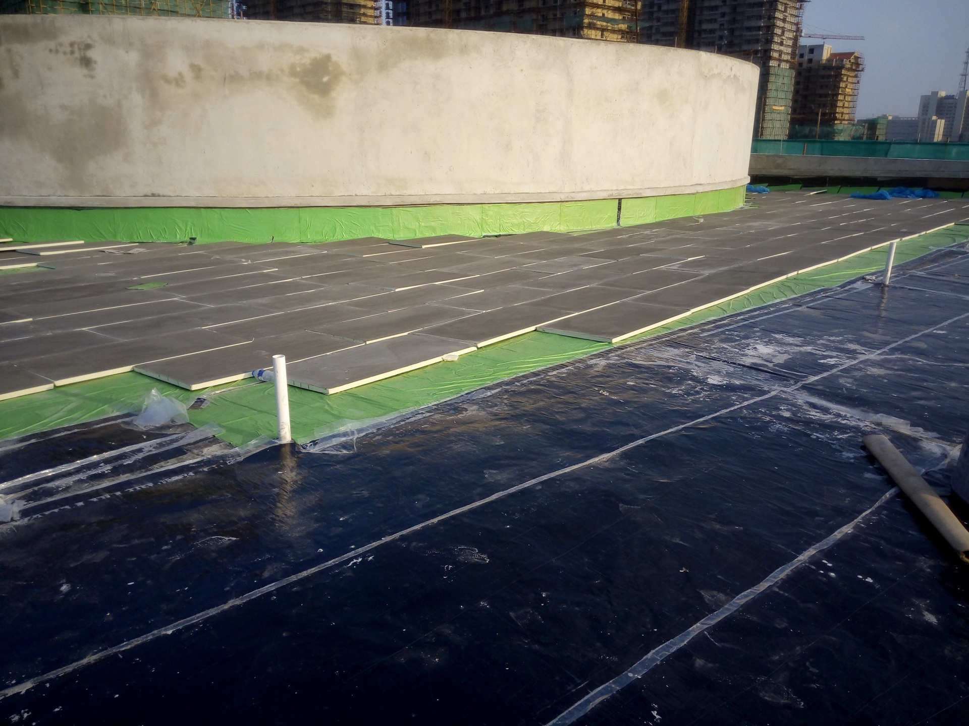 平面和立面部位的防水層施工完畢并經(jīng)檢查驗(yàn)收合格后,宜在防水層上虛鋪一層瀝青防水卷材做保護(hù)隔離層,鋪設(shè)時(shí)宜用少許膠粘劑固定,以防在澆筑細(xì)石混凝土剛性保護(hù)層時(shí)發(fā)生位移。保護(hù)隔離層鋪設(shè)完畢,即可澆筑40~50mm厚的細(xì)石混凝土保護(hù)層。在澆筑細(xì)石混凝土的過程中,切勿損失保護(hù)隔離層和卷材防水層。如有損失必須及時(shí)對(duì)卷材防水層進(jìn)行修補(bǔ),修補(bǔ)后再繼續(xù)澆筑細(xì)石混凝土保護(hù)層,以免留下滲漏隱患。
