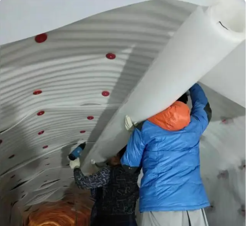 隧道EVA吊掛式防水板的安裝方法是:先在基礎(chǔ)表面涂刷專用膠水,然后將防水板吊掛在基礎(chǔ)表面上,并用專用膠水將各板材粘接在一起,最后用專業(yè)工具在板材連接處進(jìn)行密封處理。該防水板施工完畢后,可在其表面覆蓋一層防護(hù)層,以保護(hù)其不受外力破壞和污染。